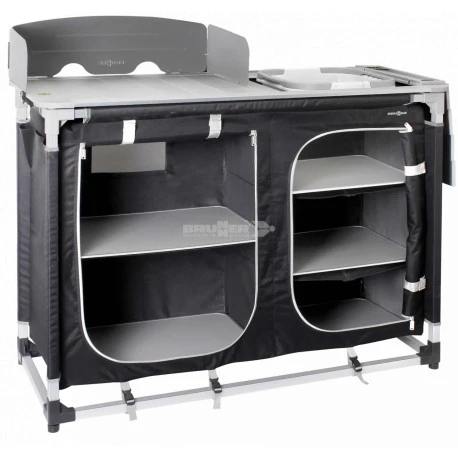Pratica cucina da campeggio con lavello pieghevole integrato e rimovibile e 2 grandi vani portaoggetti con tanto di spazio per il cibo e gli utensili da cucina.